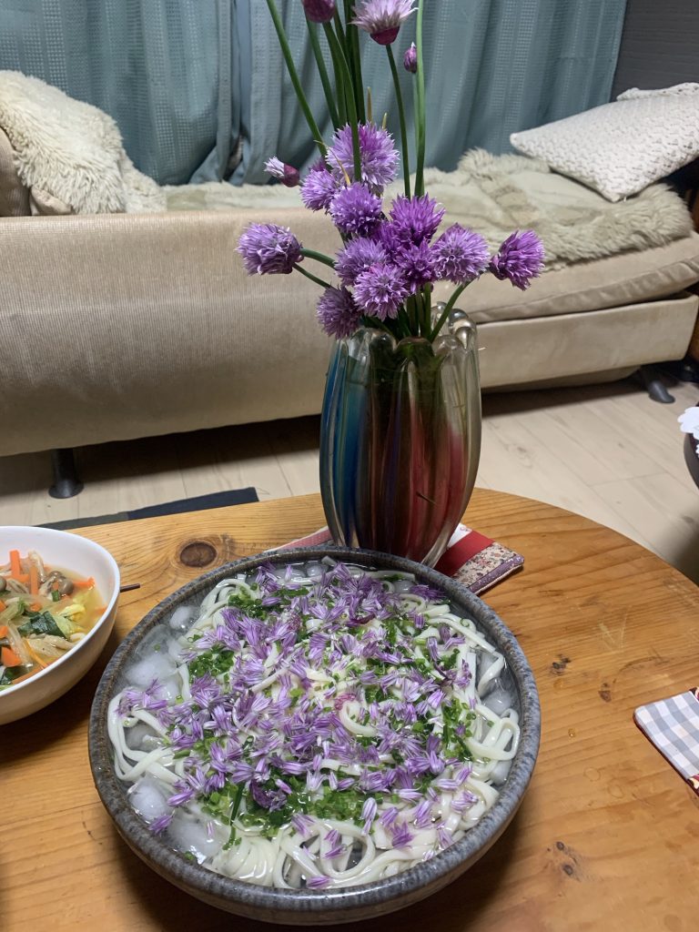 夏の暑く食欲のない時私はチャイブの花ソーメンやうどんに助けられています